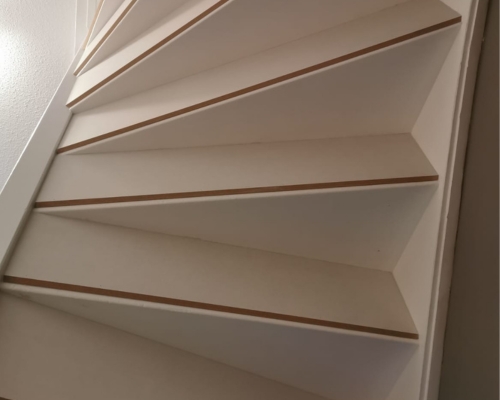 Bij hetafwerken van de achterkant van een trap komt veel kijken. Wij gebruiken daarvoor van een wit eenkeer gegrond MDF plaat. Deze platen zijn ideaal voor het dichtmaken van open trappen, omdat ze niet alleen esthetisch aantrekkelijk zijn, maar ook eenvoudig te installeren. Door de MDF platen op maat te snijden en stevig te bevestigen, creëer wij een strakke en moderne uitstraling voor uw trap. Bovendien zorgt de witte afwerking voor een frisse look, die perfect past in diverse interieurstijlen. Het afwerken van de achterkant van de trap met deze materialen is een praktische en stijlvolle oplossing voor ieder huis. U kunt de achterkant van u trap laten schilderen zodra de renovatie afgerond is naar de gewenste kleur.